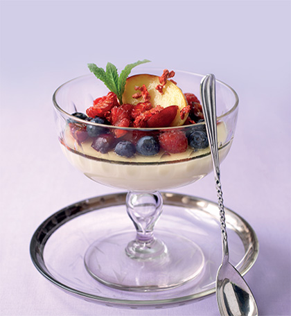 Light vanilla panna cotta paired with a bright minestrone of berries and peach for a fresh, elegant seasonal dessert.